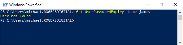 PROCESS { Write-Verbose "Searching for users" If ($Name) { $UserExpiry = Get-ADUser -filter "cn -like '*$Name*'" –Properties "DisplayName", "msDS-UserPasswordExpiryTimeComputed" | Select-Object -Property "Displayname", @{ Name = "ExpiryDate"; Expression = { [datetime]::FromFileTime($_."msDS-UserPasswordExpiryTimeComputed") } } } ElseIf ($SAM) { $UserExpiry = Get-ADUser -identity $SAM –Properties "DisplayName", "msDS-UserPasswordExpiryTimeComputed" | Select-Object -Property "Displayname", @{ Name = "ExpiryDate"; Expression = { [datetime]::FromFileTime($_."msDS-UserPasswordExpiryTimeComputed") } } } Else { Write-Host -ForegroundColor Red "No search input provided" } If ($UserExpiry -ne $Null) { ForEach ($UserExpiry in $UserExpiry) { Write-Host $UserExpiry.displayname "-" $UserExpiry.expirydate } } Else { Write-Host -ForegroundColor Yellow "User not found" } }