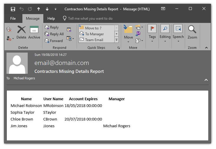 Notify manager of contractor Active Directory user account expiry via email and notify the service desk of any incomplete user accounts.